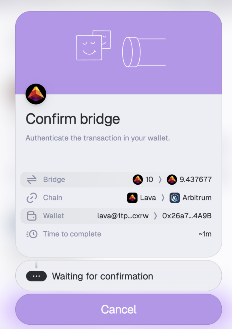 The process might take a few minutes to complete. Now check your EVM wallet to confirm that your funds have arrived - you should find LAVA tokens on a list of your owned tokens.